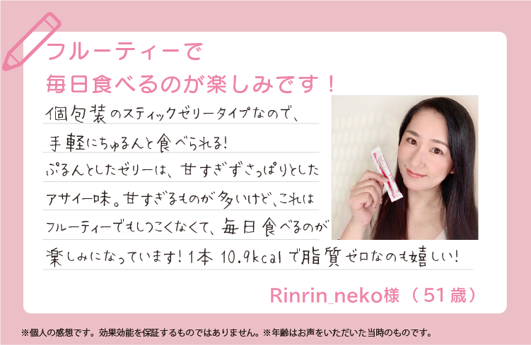 乳糖果糖オリゴ糖、コラーゲンペプチド(ゼラチンを含む)、こんにゃく芋粉摘出物(セラミド含有)、グレープ果汁、アップル果汁、アサイーエキス/クエン酸、ゲル化剤(増粘多糖類)、香料、乳化剤