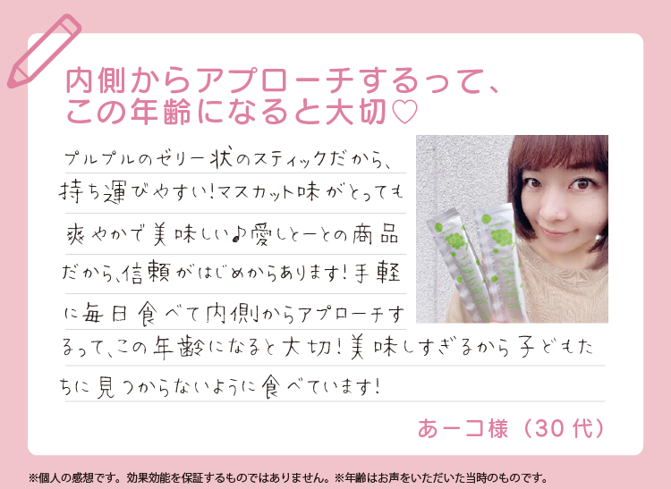 果糖ぶどう糖液糖(国内製造)、コラーゲンペプチド(ゼラチンを含む)、砂糖、マスカット果汁/ゲル化剤(増粘多糖類)、pH調整剤、香料、パントテン酸Ca